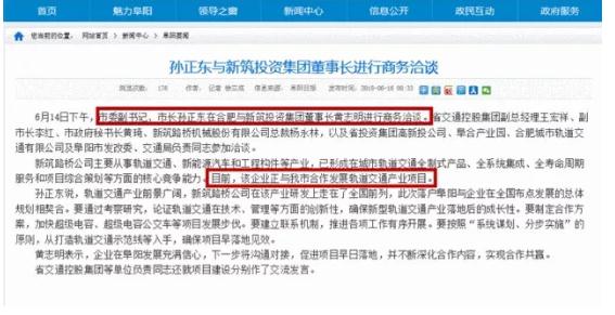 市委副书记、市长孙正东亲自出马在合肥与新筑投资集团进行商务洽谈。目前,该企业正与我市合作发展轨道交通产业项目,市长亲自对接新筑投资集团!